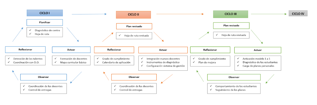 - CICLO I: Planificar el plan de acción a partir del diagnóstico del centro, formar a los docentes y diseñar los primeros materiales didácticos.